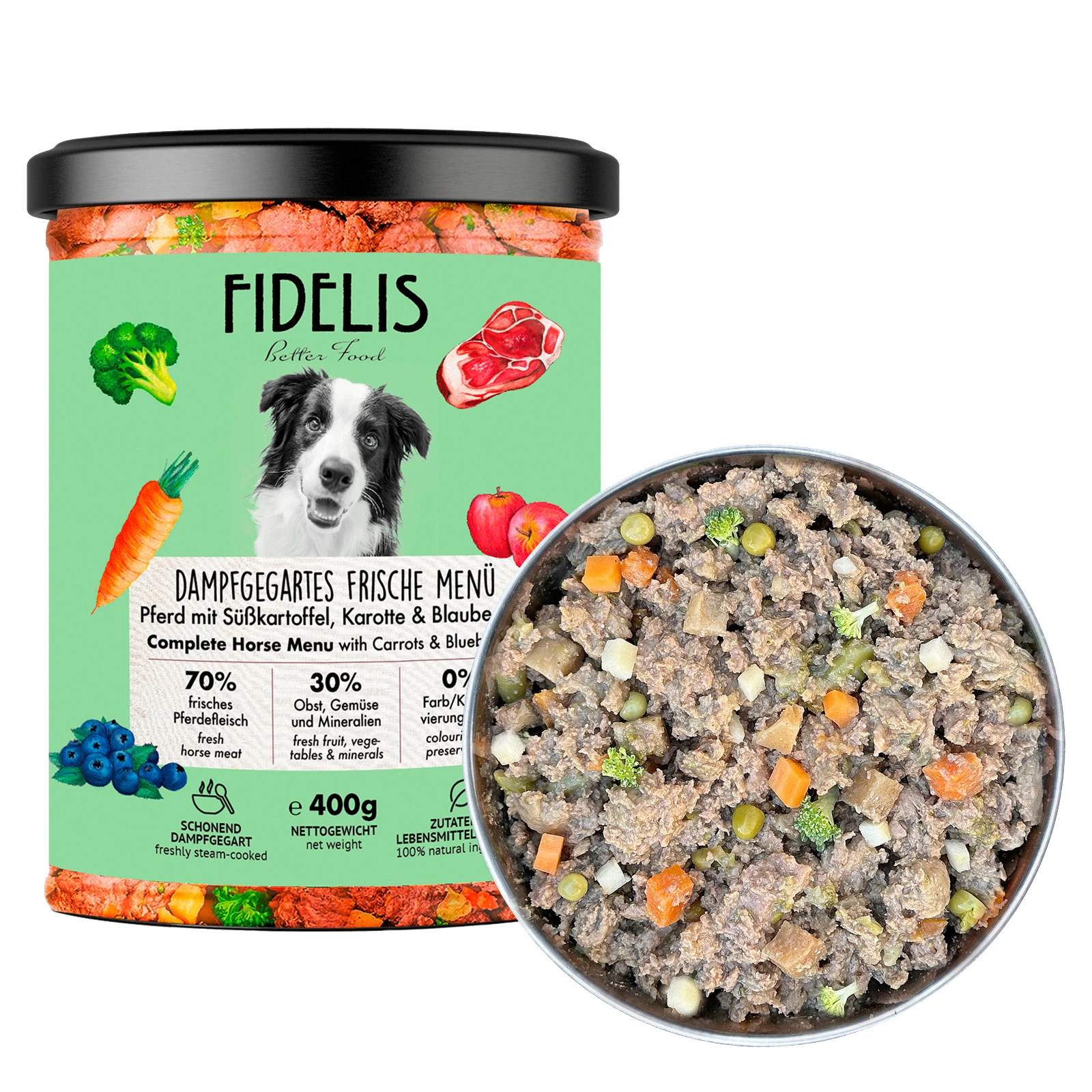A FIDELIS Főtt Menü – Friss lóhús, édesburgonya, répa és áfonya különleges, kíméletes főtt kutyaeledel, amely természetes összetevőivel és házikoszt jellegű ízvilágával a legérzékenyebb kutyák számára is ideális választás. Minden üveg kizárólag emberi fogyasztásra alkalmas alapanyagokból készül: friss izomhúsból, egészséges belsőségekből, zöldségekből, gyümölcsökből, olajokból és gyógynövényekből – adalékanyagok és tartósítószerek nélkül.