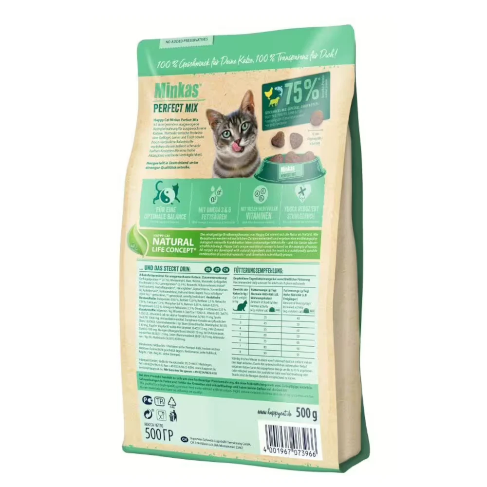 A Happy Cat Minkas Perfect Mix tökéletes választás, ha egy változatos, ízletes és kiegyensúlyozott szárazeledelt keresel macskád számára a mindennapokra.