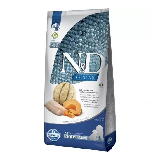 Az N&D Ocean tőkehal sütőtök sárgadinnye puppy medium/maxi egy teljes értékű, gabonamentes száraztáp közepes és nagytestű kölyök kutyák, valamint vemhes és szoptató szukák számára. Kifejezetten azoknak a kutyáknak lett kifejlesztve, akiknek az életkorukból vagy állapotukból fakadóan kiemelkedő tápanyagigényük van.