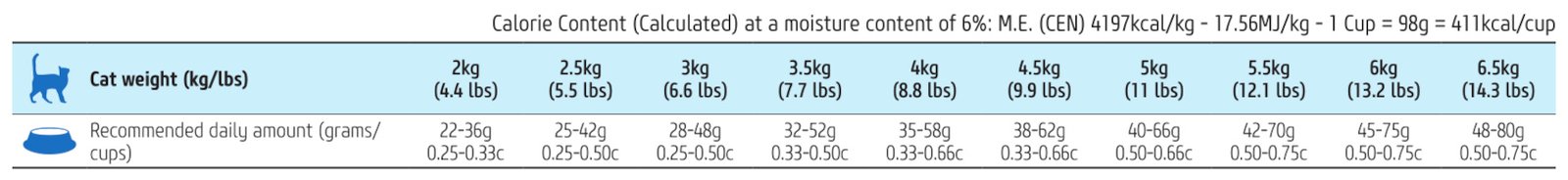 Tápértékkel rendelkező adalékanyagok: A-vitamin 18000NE; D3-vitamin 1200NE; E-vitamin 600mg; C-vitamin 300mg; niacin 150mg; kalcium-D-pantotenát 50mg; B2-vitamin 20mg; B6-vitamin 8,1mg; B1-vitamin 10mg; Biotin 1,5mg; folsav 1,5mg; B12-vitamin 0,1mg; Kolin-klorid 2500mg; Béta-karotin 1,5mg; Cink (metionin-hidroxi-analóg cinkkelátja): 163,8mg; Mangan (metionin-hidroxi-analóg mangánkelátja): 64,6mg; Vas (glicin-hidrát vas (II)-kelátja): 58,3mg; Réz (metionin-hidroxi-analóg rézkelátja): 15,8mg; DL-metionin ipari tisztaságú 5000mg; taurin 4000mg; L-karnitin 300mg. Érzékszervi tulajdonságokat javító adalékanyagok: zöldtea kivonat 100mg; rozmaring kivonat. Antioxidánsok: növényi olajokból származó tokoferol kivonatok.