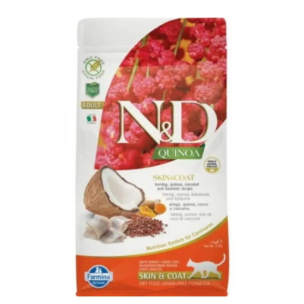Az N&D Quinoa Cat Skin & Coat Hering speciális igényű, érzékeny macskák számára készült, akiknél gyakran jelentkezik viszketés, bőrgyulladás, szőrhullás vagy ételintolerancia. A receptúra limitált összetevőkből áll, egyetlen, ritkán használt állati fehérjeforrással – heringgel –, így ideális választás eliminációs vagy érzékeny étrend esetén.