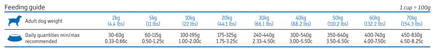 Nyersfehérje 24.00%; nyerszsír 18.00%; nyersrost 3.40%; nyershamu 6.90%; kalcium 0.75%; foszfor 0.55%; nátrium 0.15%; kálium 0.70%; magnézium 0.10%; Omega-3 zsírsavak 0.90%; Omega-6 zsírsavak 3.50%; EPA 0.25%; DHA 0.30%.