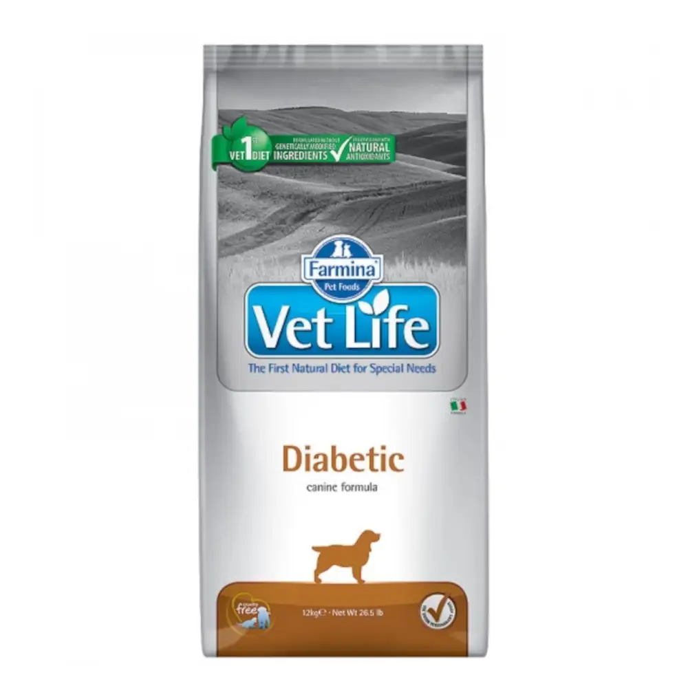 A Farmina Vet Life Diabetic teljes értékű diétás száraztáp, amelyet kifejezetten a glükóz ellátás szabályozására fejlesztettek ki cukorbetegségben szenvedő kutyák számára. Összetétele úgy lett kialakítva, hogy segítse a vércukorszint stabilizálását, mérsékelje a hirtelen glükózingadozásokat, és támogassa a testsúly csökkentését is túlsúlyos vagy inzulinrezisztens kutyáknál.