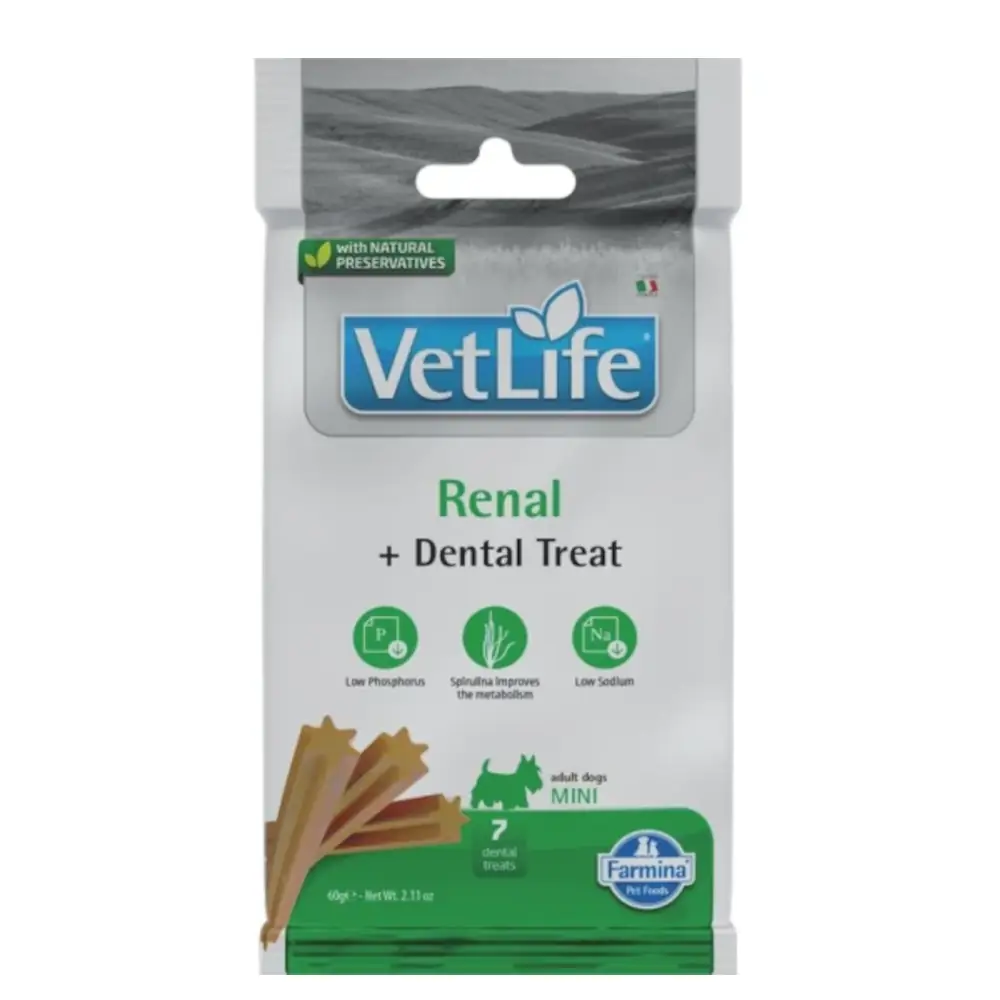 A Vet Life Dog Fogtisztító Renal egy speciálisan összeállított fogtisztító jutalomfalat, amelyet kifejezetten olyan kutyák számára fejlesztettek ki, akiknek étrendje a veseműködés támogatását igényli. A termék kíméletesen tisztítja a fogakat, segít csökkenteni a lepedék- és fogkőképződést, miközben összetétele alkalmas a veseproblémákkal élő kutyák számára is.