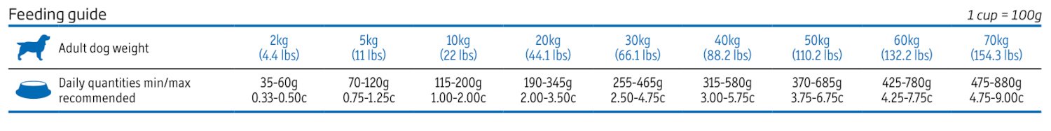 Nyersfehérje 18.00%; nyerszsír 13.00%; nyersrost 1.70%; nyershamu 7.60%; kalcium 0.70%; foszfor 0.50%; nátrium 0.25%; kálium 1.10%; magnézium 0.095%; Omega-6 zsírsavak 0.40%; Omega-3 zsírsavak 2.20%; EPA 0.60%; DHA 0.83%.