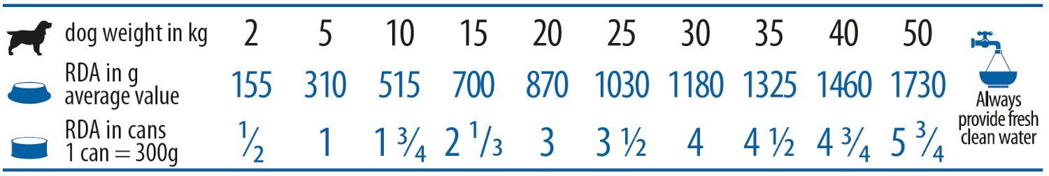 Nyersfehérje 13,70%; nyerszsír 5,10%; nyersrost 2,30%; nyershamu 2,80%; nedvesség 71,50%; kalcium 0,30%; foszfor 0,25%; keményítő 2,30%; összes cukor 0,80%; nátrium 0,16%; kálium 0,24%; Omega-6 zsírsavak 0,90%; Omega-3 zsírsavak 0,50%; EPA 0,10%; DHA 0,10%.