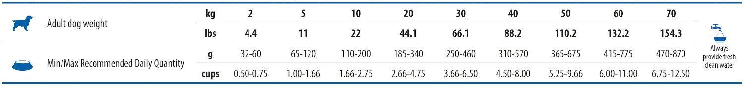 Nyersfehérje 18,00%; Nyerszsír 7,00%; Nyersrost 1,20%; Nyershamu 5,30%; Kalcium 0,70%; Foszfor 0,50%; Nátrium 0,25%; Kálium 0,70%; Magnézium 0,110%; Omega-3 zsírsavak 1,10%; Omega-6 zsírsavak 1,50%; EPA 0,25%; DHA 0,35%.